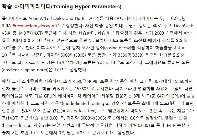 사전 학습 단계에서는 14.8조 개의 다양하고 높은 품질의 토큰을 학습에 활용하였다. 학습 과정은 매우 안정적으로 진행되어, 전체 훈련 기간 동안 되돌릴 수 없는 수준의 손실(spike)이 발생하거나 롤백을 수행해야 하는 상황이 한 번도 없었다. 이후 DeepSeek-V3에 대해 두 단계로 맥락 길이(context length)를 확장하였다. 첫 번째 단계에서 최대 맥락 길이를 32K로 확장하고, 두 번째 단계에서 이를 128K까지 늘렸다. 그 뒤, DeepSeek-V3의 베이스(base) 모델을 대상으로 한 지도 학습(Supervised Fine-Tuning, SFT)과 강화 학습(RL) 단계를 진행하여 사람의 선호도와 더욱 정교하게 정렬(alignment)시키고 모델의 잠재력을 극대화하였다. 이 과정에서 DeepSeek-R1 계열 모델로부터 추론 능력을 증류(distillation)하는 한편, 모델 정확도와 생성 길이 간 균형도 신중히 유지하였다.