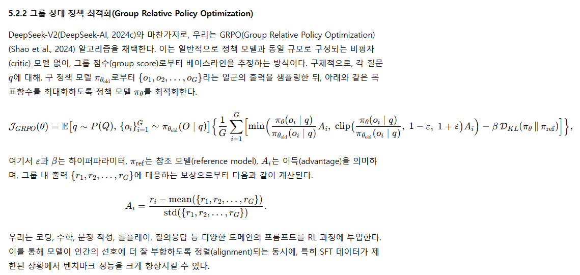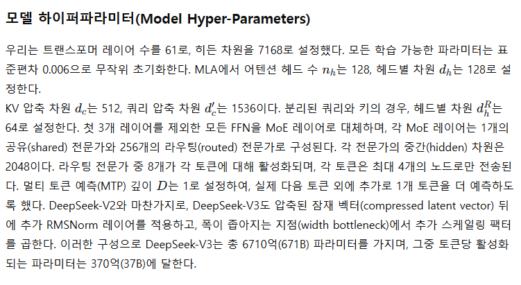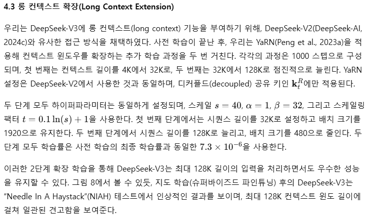 - H800 GPU 시간 2.664M만으로 14.8조 토큰에 대한 사전 학습을 완료함으로써, 현재 공개된 모델 중 가장 강력한 오픈소스 베이스 모델을 생산하였다. 사전 학습 이후 단계인 맥락 길이 확장과 포스트 트레이닝에는 약 0.1M GPU 시간만 필요하다.