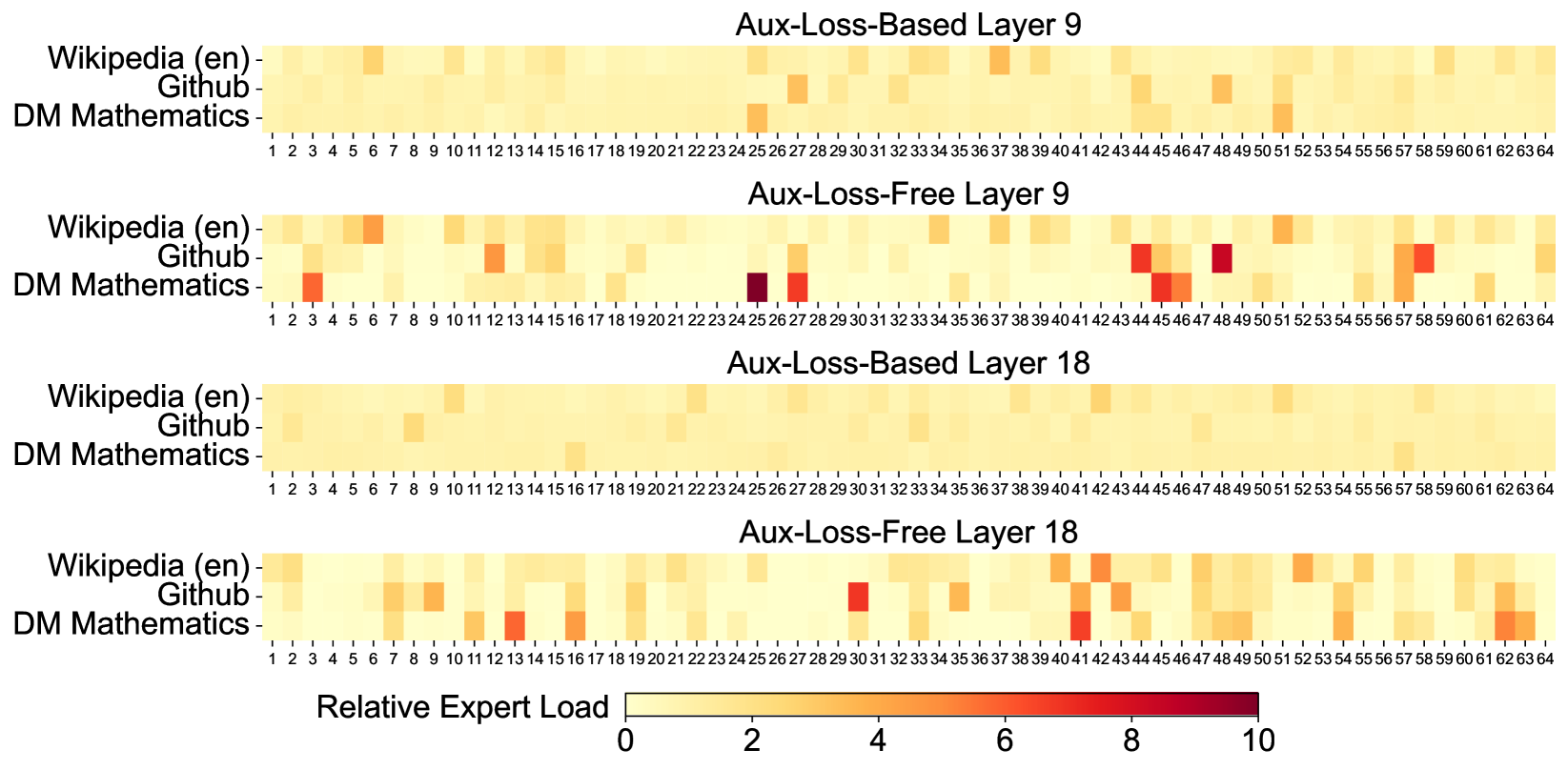 보조 손실 없는 로드 밸런싱(auxiliary-loss-free)과 시퀀스 단위(sequence-wise) 보조 손실을 비교했을 때, 두 방식의 차이는 로드 밸런싱 범위—즉, 배치 단위와 시퀀스 단위—에 있다. 시퀀스 단위 보조 손실은 각 시퀀스 내부에서 균형을 강제하지만, 배치 단위 로드 밸런싱은 이보다 더 유연하게, 도메인별 특화(specialization)를 허용할 수 있다. 이를 검증하기 위해, 우리는 160억(16B) 파라미터 규모의 보조 손실 기반 베이스라인 모델과, 160억 파라미터 규모의 보조 손실 없는 모델을 Pile 테스트 세트 내 다른 도메인에서의 전문가 로드를 기록·분석하였다. 그림 9에서 확인할 수 있듯, 보조 손실 없는 모델은 더 강한 전문가 특화 패턴을 보임을 관찰할 수 있다.