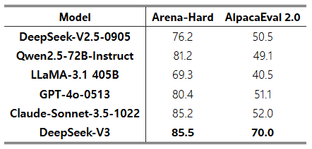 - Arena-Hard에서, DeepSeek-V3는 기존 GPT-4-0314 대비 86% 이상의 승률을 달성하며, Claude-Sonnet-3.5-1022 등 최상위 모델과 대등한 모습을 보인다. 이는 코드·디버깅 등 복잡 프롬프트 처리가 강력함을 입증하며, DeepSeek-V3가 오픈소스 모델 최초로 Arena-Hard에서 85%를 넘겨 오픈소스와 폐쇄형 모델 간 성능 격차를 크게 줄였음을 뜻한다.