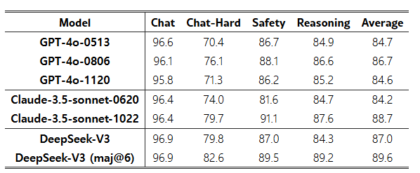 Table 8: GPT-4o, Claude-3.5-Sonnet, DeepSeek-V3의 RewardBench 성능 비교.