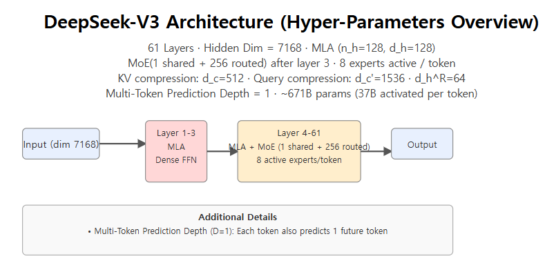 학습 중 모델 파라미터에 대한 지수이동평균(EMA)을 CPU 메모리에 저장하고, 각 스텝이 끝날 때마다 비동기적으로 업데이트한다. 이를 통해 별도의 GPU 메모리나 추가 계산 시간을 거의 소모하지 않고서도 EMA 파라미터를 유지해, 학습률 감소 후 모델 성능을 조기에 추정할 수 있다. - 멀티 토큰 예측용 임베딩 및 출력 헤드 공유(Shared Embedding and Output Head for Multi-Token Prediction)