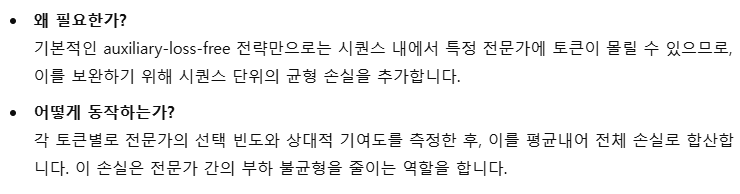 이 유연성과 모델 성능 우세 간의 상관관계를 추가로 조사하기 위해, 우리는 “시퀀스 단위가 아니라, 각 학습 배치(batch) 단위로 로드 밸런스를 유도하는” 배치 단위 보조 손실(batch-wise auxiliary loss)을 추가로 설계·검증하였다. 실험 결과, 비슷한 수준의 배치 단위 로드 밸런스를 달성하는 경우, 배치 단위 보조 손실 역시 보조 손실 없는 방식과 유사한 모델 성능을 얻을 수 있었다. 구체적으로, 10억(1B) 규모 MoE 모델 실험에서 검증 손실(validation loss)은 시퀀스 단위 보조 손실이 2.258, 보조 손실 없는 방식이 2.253, 배치 단위 보조 손실 역시 2.253을 기록하였다. 30억(3B) 규모 MoE 모델에서도 유사한 결과를 얻어, 시퀀스 단위 보조 손실 모델 검증 손실이 2.085, 보조 손실 없는/배치 단위 보조 손실 모델은 모두 2.080이었다.