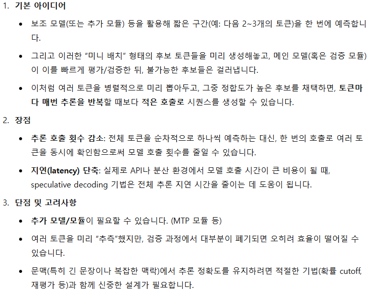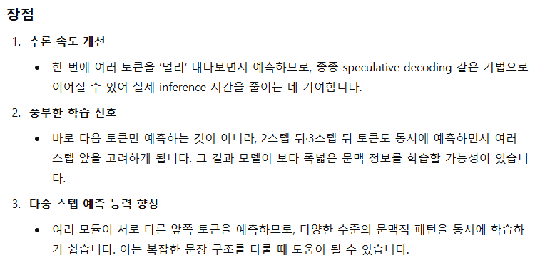 - 멀티 토큰 예측(Multi-Token Prediction, MTP) 학습 목표를 적용해 모델 성능이 향상됨을 확인하였으며, 이는 추론 속도를 높이는 speculative decoding에도 활용 가능하다.
