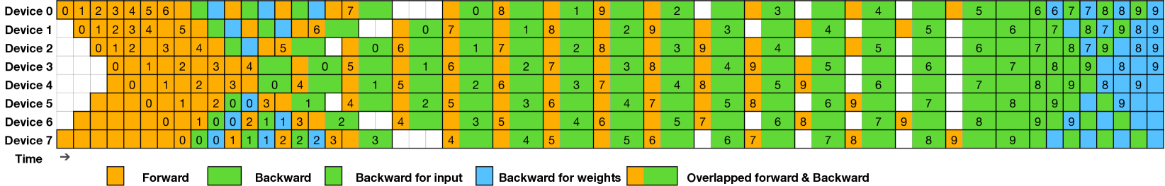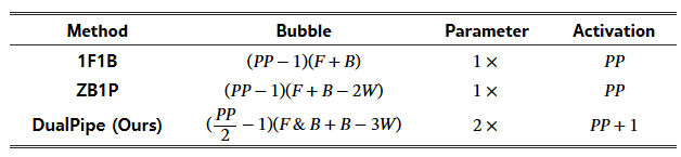 Table 2: 다양한 파이프라인 병렬 기법 간 파이프라인 버블 및 메모리 사용량 비교. F는 순방향 청크 실행 시간, B는 전체 역방향 청크 실행 시간, W는 “역방향 가중치(backward for weights)” 청크의 실행 시간, F&B는 상호 겹치는 순방향 및 역방향 청크 두 개의 실행 시간을 나타낸다.