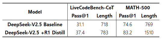 우리는 DeepSeek-V2.5 기반 실험에서, DeepSeek-R1로부터 지식을 증류(distillation)하는 방안이 얼마나 기여하는지를 분석한다. 베이스라인 모델은 짧은 Chain-of-Thought(CoT) 데이터로 학습했으며, 비교 대상은 위에서 언급한 전문가 체크포인트(expert checkpoints)가 생성한 데이터를 사용했다.