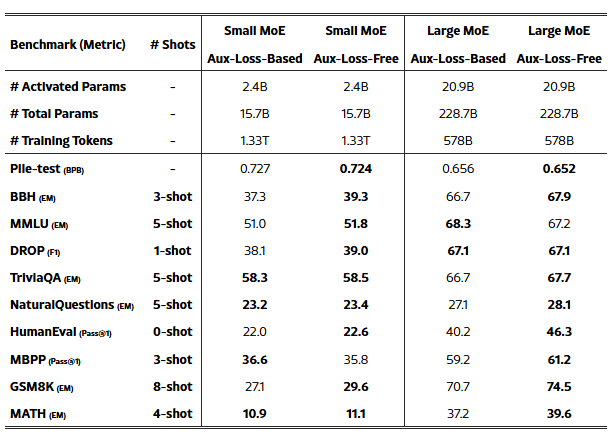 표의 결과를 보면, 보조 손실 없는(auxiliary-loss-free) 전략이 대부분의 평가 벤치마크에서 더 나은 모델 성능을 꾸준히 달성함을 알 수 있다.