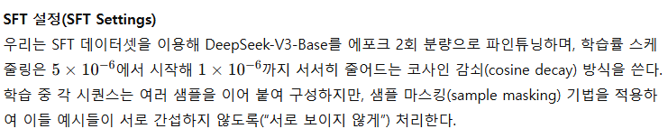 RL 학습이 끝나면, 전문가 모델들을 데이터 생성원으로 활용하여 거부 샘플링(rejection sampling) 방식으로 고품질의 SFT 데이터를 선별한다. 이 방식은 DeepSeek-R1의 강점을 유지하면서도 간결하고 효율적인 답변을 생성할 수 있는 최종 학습 데이터를 확보하게 해준다.
