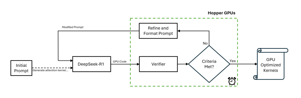 NVIDIA 엔지니어들은 DeepSeek-R1 모델과 함께 특수한 검증기(verifier)를 추가하여, 사전에 정해진 시간 동안 반복적으로 코드 생성과 검증을 수행하는 새로운 워크플로우를 만들었습니다.