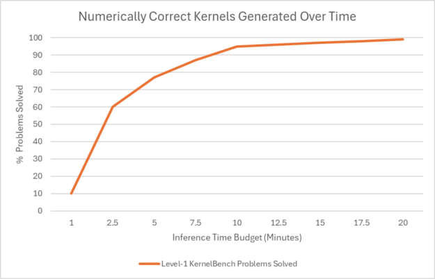 이 차트는 문제당 10분 이상의 시간을 할당할 경우, Level-1 카테고리의 100가지 문제 중 대부분에서 수치적으로 정확한 코드를 생성할 수 있게 됨을 보여줍니다. 그래프는 대략 10분쯤에서 95%에 도달하고, 20분에 100%에 다다릅니다.