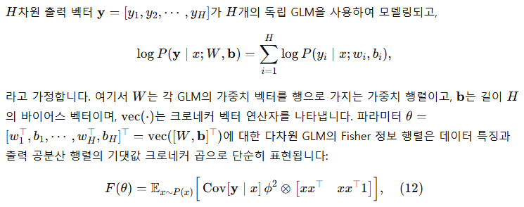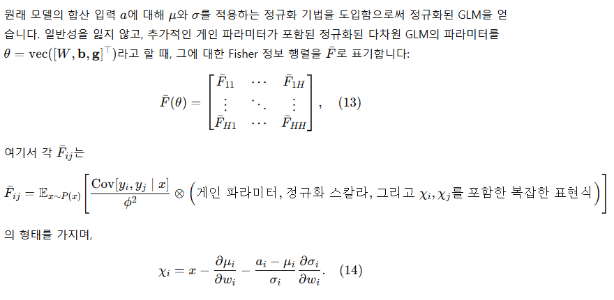 본 분석은 일반화 선형 모델(GLM)에 초점을 맞춥니다. 아래의 분석 결과는 Fisher 정보 행렬에 대해 블록 대각선 근사를 사용하는 심층 신경망—각 블록이 단일 뉴런의 파라미터에 해당하는—을 이해하는 데에도 쉽게 적용될 수 있습니다.