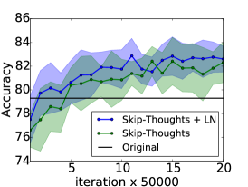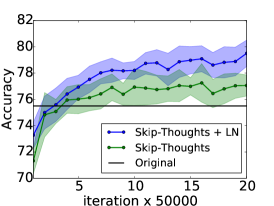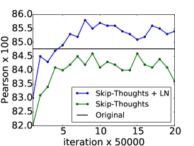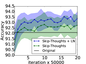 본 실험에서는 레이어 정규화가 훈련 속도를 얼마나 향상시킬 수 있는지를 조사합니다. 우리는 Kiros et al. [2015]의 공개 코드를 사용하여⁴ (https://github.com/ryankiros/skip-thoughts), BookCorpus 데이터셋 [Zhu et al., 2015]에서 레이어 정규화가 적용된 모델과 적용되지 않은 모델, 두 가지를 훈련시켰습니다. 이 실험은 Theano [Team et al., 2016]를 사용하여 수행되었으며, Kiros et al. [2015]에서 사용한 실험 설정에 따라 동일한 하이퍼파라미터로 2400차원의 문장 인코더를 훈련시켰습니다. 사용된 상태의 크기를 고려할 때, 레이어 정규화가 적용된 경우 반복 당 업데이트 속도가 느려질 수 있을 것으로 예상되지만, CNMeM⁵ (https://github.com/NVIDIA/cnmem)을 사용하면 두 모델 간에 유의미한 차이가 없음을 확인했습니다. 두 모델 모두 50,000 반복마다 체크포인트를 저장하며, 의미 유사도 평가(SICK) [Marelli et al., 2014], 영화 리뷰 감성 분석(MR) [Pang and Lee, 2005], 고객 제품 리뷰(CR) [Hu and Liu, 2004], 주관성/객관성 분류(SUBJ) [Pang and Lee, 2004], 의견 극성 분류(MPQA) [Wiebe et al., 2005]의 다섯 가지 작업에서 성능을 평가하였습니다. 각 체크포인트에서 두 모델의 성능을 모든 작업에 대해 플롯하여 레이어 정규화가 성능 향상 속도를 개선하는지 확인했습니다.