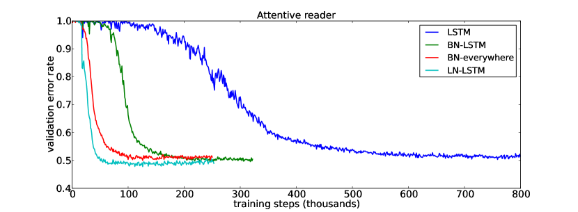 그림 2: Attentive reader 모델의 검증 곡선. BN 결과는 [Cooijmans et al., 2016]에서 가져옴.