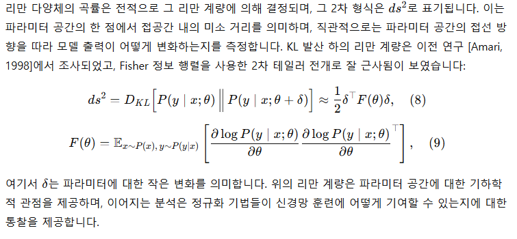 모델의 파라미터를 조금 바꿨을 때 출력이 얼마나 달라지는지를 측정하는 한 가지 방법이 KL 발산을 이용한 리만 계량입니다. 쉽게 말하면, 파라미터가 조금 변할 때 모델의 예측이 얼마나 민감하게 반응하는지를 ‘거리’로 나타낸다고 볼 수 있습니다. - 정규화가 학습률에 미치는 영향