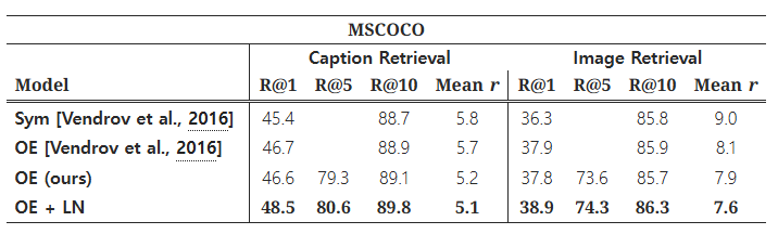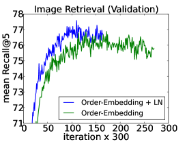 이 실험에서는 Vendrov et al. [2016]에서 제안한 이미지와 문장을 위한 공동 임베딩 공간 학습 모델인 order-embeddings 모델에 레이어 정규화를 적용했습니다. 우리는 Vendrov et al. [2016]의 실험 프로토콜을 그대로 따르고, 공개된 코드를 수정하여 레이어 정규화를 반영하였습니다¹ (https://github.com/ivendrov/order-embedding). 이 코드는 Theano [Team et al., 2016]를 활용합니다. Microsoft COCO 데이터셋 [Lin et al., 2014]의 이미지와 문장은 공통 벡터 공간으로 임베딩되며, 문장은 GRU [Cho et al., 2014]를 사용해 인코딩하고, 미리 학습된 VGG ConvNet [Simonyan and Zisserman, 2015] (10-crop) 출력으로 이미지를 인코딩합니다. order-embeddings 모델은 이미지와 문장을 2단계의 부분 순서로 표현하며, Kiros et al. [2014]에서 사용된 코사인 유사도 대신 비대칭 유사도 함수를 사용합니다.