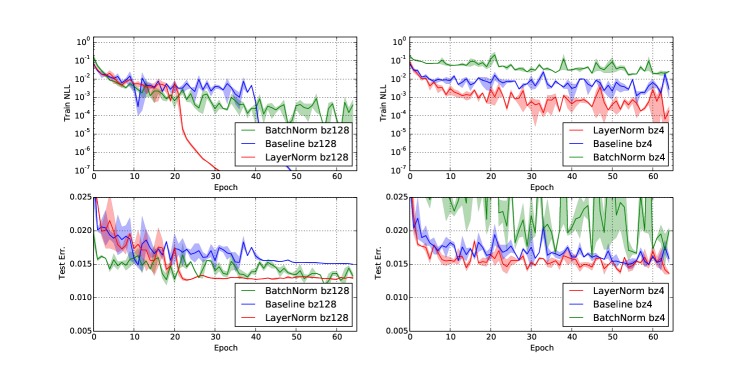 그림 6: 레이어 정규화와 배치 정규화를 적용한 permutation invariant MNIST 784-1000-1000-10 모델의 음의 로그 우도 및 테스트 오류. (왼쪽) 모델은 배치 크기 128로 훈련되었고, (오른쪽) 모델은 배치 크기 4로 훈련되었습니다.