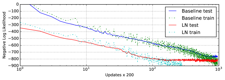 작은 미니 배치 크기와 매우 긴 시퀀스의 조합은 매우 안정적인 은닉 동역학이 매우 중요함을 의미합니다. 그림 5는 레이어 정규화를 적용한 모델이 baseline 모델과 유사한 로그 우도에 수렴하면서도 훨씬 빠르게 수렴함을 보여줍니다.