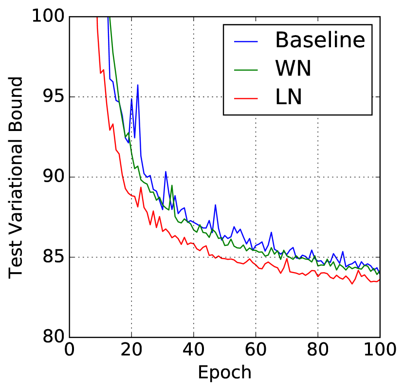 그림 4는 첫 100 에포크 동안의 테스트 변분 경계를 보여줍니다. 이를 통해 레이어 정규화를 적용한 DRAW 모델이 baseline 모델에 비해 거의 두 배 빠르게 수렴하는 속도 향상 효과를 확인할 수 있습니다. 200 에포크 후, baseline 모델은 테스트 데이터에서 82.36 nats의 변분 로그 우도에 수렴한 반면, 레이어 정규화 모델은 82.09 nats를 달성하였습니다.