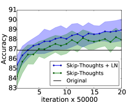 그림 3: 훈련 반복 횟수에 따른 다운스트림 작업에서 레이어 정규화 적용 유무에 따른 skip-thought 벡터의 성능. 원래의 선은 [Kiros et al., 2015]에서 보고된 결과이며, 에러 막대가 있는 그래프는 10-겹 교차 검증을 사용한 결과입니다. (컬러로 볼 때 가장 잘 보입니다.)