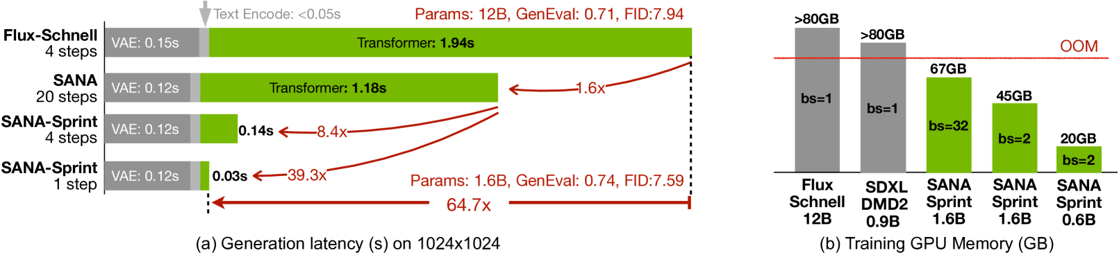 - (a) 본 논문에서 제안하는 SANA-Sprint는 1024×1024 이미지 생성의 추론 속도를 획기적으로 가속하여, 기존 최고 성능 모델인 FLUX-Schnell의 1.94초 대비 0.03초로 단축하였다. 이는 NVIDIA A100 GPU 상에서 배치 사이즈 1을 기준으로 Transformer의 지연시간(latency)을 측정한 결과이며, 현존하는 단계 증류(step-distillation) 기반 최신 모델인 FLUX-Schnell과 비교하여 64배의 성능 향상이다. (b) 추가로, 본 모델은 훈련 시 GPU 메모리를 효율적으로 활용하며, 공식 코드를 사용해 측정한 결과 기존의 다른 증류(distillation) 방법들에 비해 뛰어난 메모리 효율성을 보였다(1024×1024 이미지 기준, 단일 A100 GPU 사용).