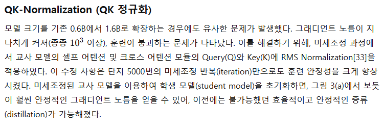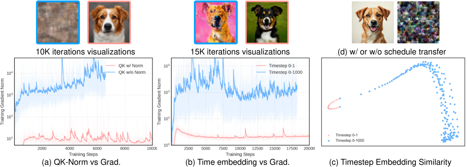- (a) QK Normalization의 유무에 따른 그래디언트 노름과 시각화 비교. QK Normalization의 안정화 효과를 보여준다.