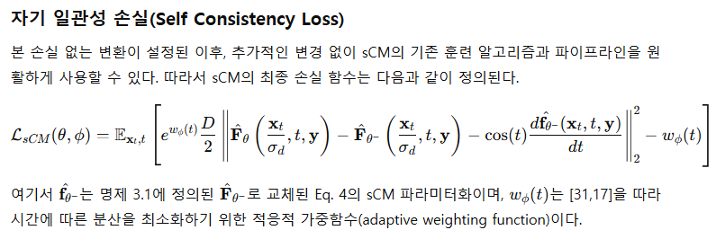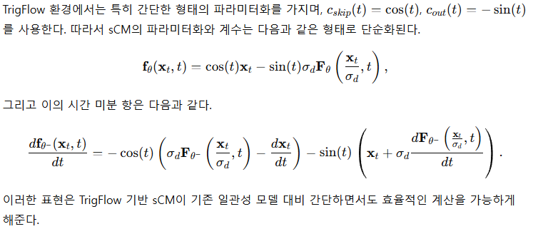 TrigFlow 기반 연속 시간 일관성 모델 (sCM)의 구체적 표현