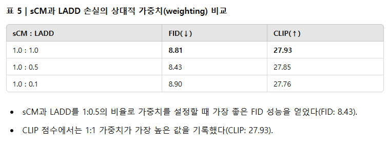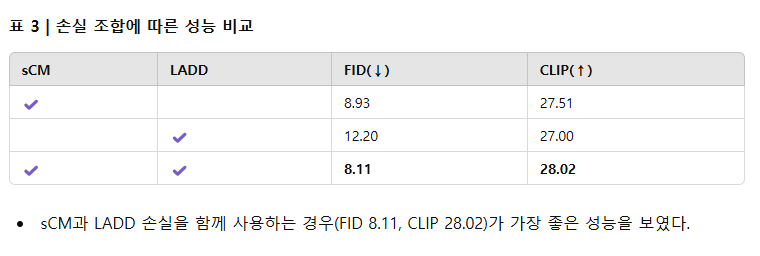 - sCM과 LADD 손실을 함께 사용하는 경우 가장 뛰어난 성능(FID 8.11, CLIP Score 28.02)을 얻어 두 손실의 상호보완적인 효과를 확인하였다.