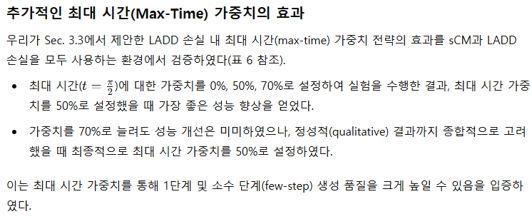 sCM 손실과 LADD 손실 각각의 효과를 평가하기 위해, sCM 손실만 또는 LADD 손실만 사용하여 훈련한 모델과 두 손실을 결합한 모델을 비교하였다(표 3 참조).