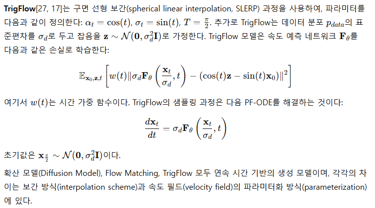 - 최초 등장: TrigFlow는 Flow Matching의 변형으로, 구면 선형 보간(SLERP)을 사용하여 각도 기반의 보간을 적용한 방법입니다.