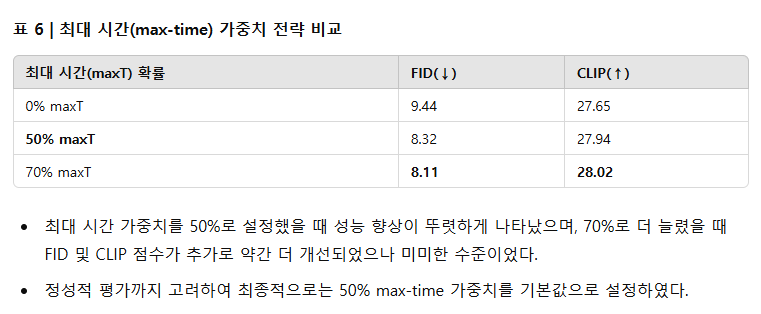 CFG 임베딩의 유무에 따른 성능 차이를 평가한 결과, 표 4에서 나타나듯이 CFG 임베딩을 적용한 경우 CLIP Score가 0.94나 향상되는 것을 확인하였다. 따라서 CFG 임베딩이 이미지 생성 품질에 크게 기여함을 입증하였다.
