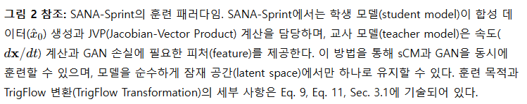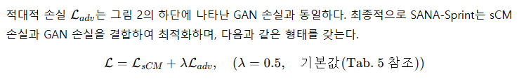 본 논문에서는 단일 단계로 고품질 텍스트-이미지(T2I) 생성을 수행할 수 있는 효율적 확산 모델인 SANA-Sprint를 제안한다. 제안하는 방법은 사전 훈련된 이미지 생성 모델인 SANA와 최근 제안된 연속 시간 일관성 모델(continuous-time consistency model, sCM)[17]을 기반으로 하며, 기존 일관성 모델의 장점을 유지하면서도 이산 시간 모델의 이산화(discretization) 오차 문제를 완화하였다. 우선 단일 단계 생성을 위해 SANA(Flow Matching 모델)를 손실 없는(lossless) 수학적 변환을 통해 sCM 증류에 적합한 TrigFlow 모델로 변환한다. 그 후 증류 과정에서의 불안정성을 완화하기 위해, 교사 모델을 재훈련하지 않고 사전 훈련된 모델로부터 효율적으로 지식을 이전할 수 있도록 SANA의 셀프 어텐션 및 교차 어텐션에서 QK norm을 조정하고 조밀한(dense) 시간 임베딩을 도입하였다. 또한 sCM과 LADD 기반 적대 증류(adversarial distillation)를 결합하여 빠른 수렴 속도와 고충실도의 생성 결과를 얻으면서 sCM의 장점 역시 유지하였다. 본 방법은 주로 SANA 모델 기반으로 검증되었으나, FLUX[21], SD3[22]과 같은 다른 플로우 매칭(flow matching) 기반 모델에도 효과적으로 적용될 수 있다.