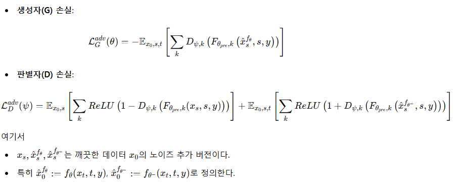 GAN[3]은 생성자(Generator) G와 판별자(Discriminator) D가 서로 경쟁하며 사실적인 데이터를 생성하는 제로섬(zero-sum) 게임 구조를 갖는다. Diffusion-GAN[34] 및 LADD[5]는 이를 확장하여 판별자가 노이즈가 추가된 실제(real)와 가짜(fake) 샘플을 구분하도록 설계하였다. 특히 LADD는 고정된(frozen) 교사 모델을 특징(feature) 추출기로 활용하고, 다중 판별자 헤드(head)를 교사 모델 위에 훈련하는 방식을 제안하였다. 이로 인해 픽셀(pixel) 공간이 아니라 잠재(latent) 공간에서 직접적인 적대적 감독을 제공하여 더 효율적이고 효과적인 훈련을 가능케 했다.