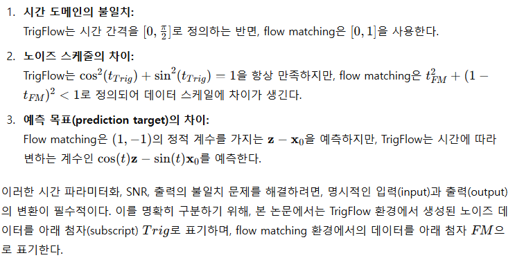 스코어 기반 생성 모델(score-based generative models)인 diffusion, flow matching, TrigFlow 등은 적절한 데이터 스케일과 신호대잡음비(SNR, Signal-to-Noise Ratio)에 따라 데이터를 디노이징(denoising)할 수 있다¹. 하지만, flow matching 모델을 TrigFlow 스케줄로 생성된 데이터에 직접 적용할 경우 다음과 같은 세 가지 주요 불일치가 발생한다.