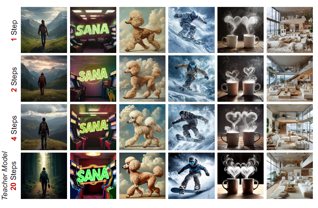 그림 5 | 서로 다른 추론 단계로 생성한 SANA-Sprint 이미지와 교사 모델 SANA의 시각적 비교.