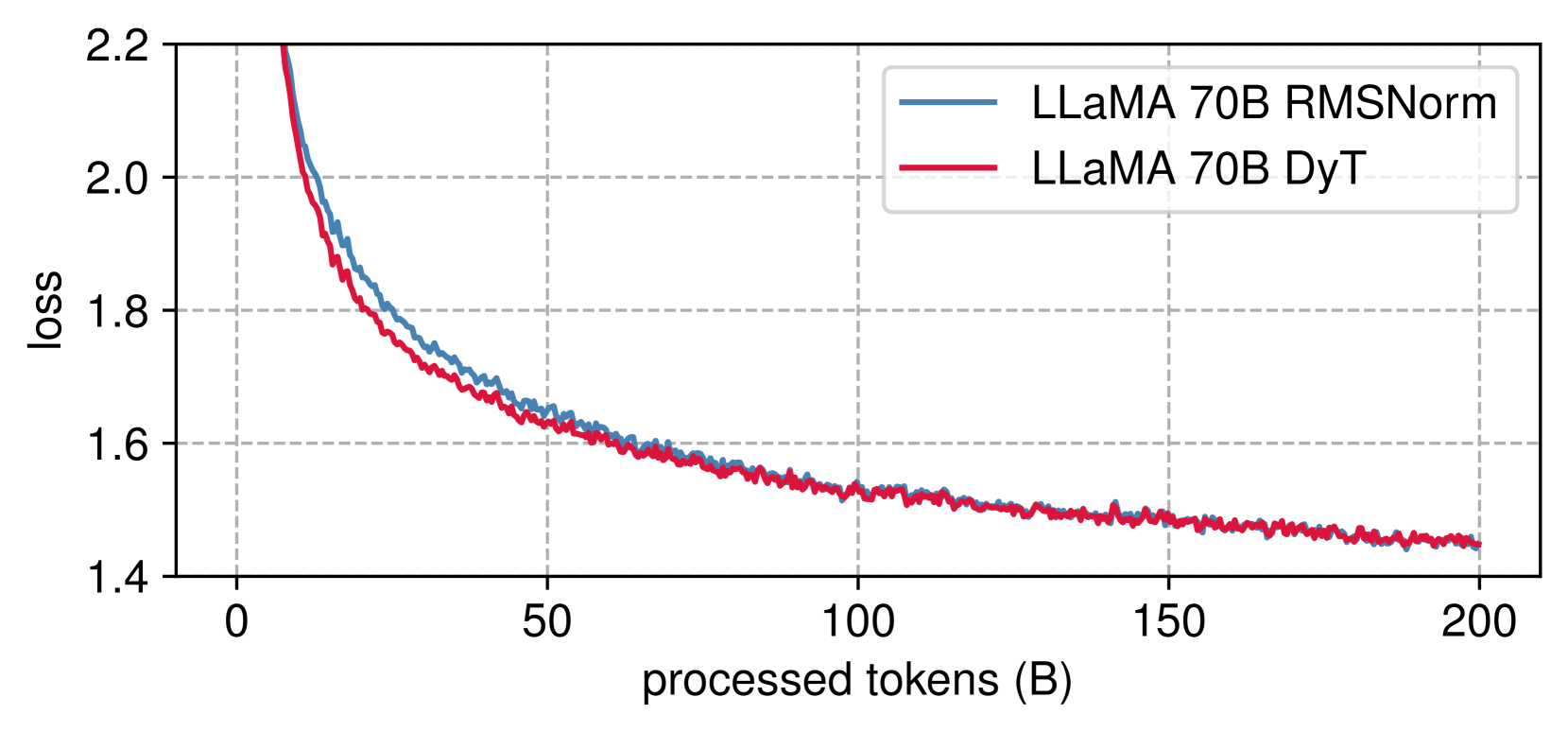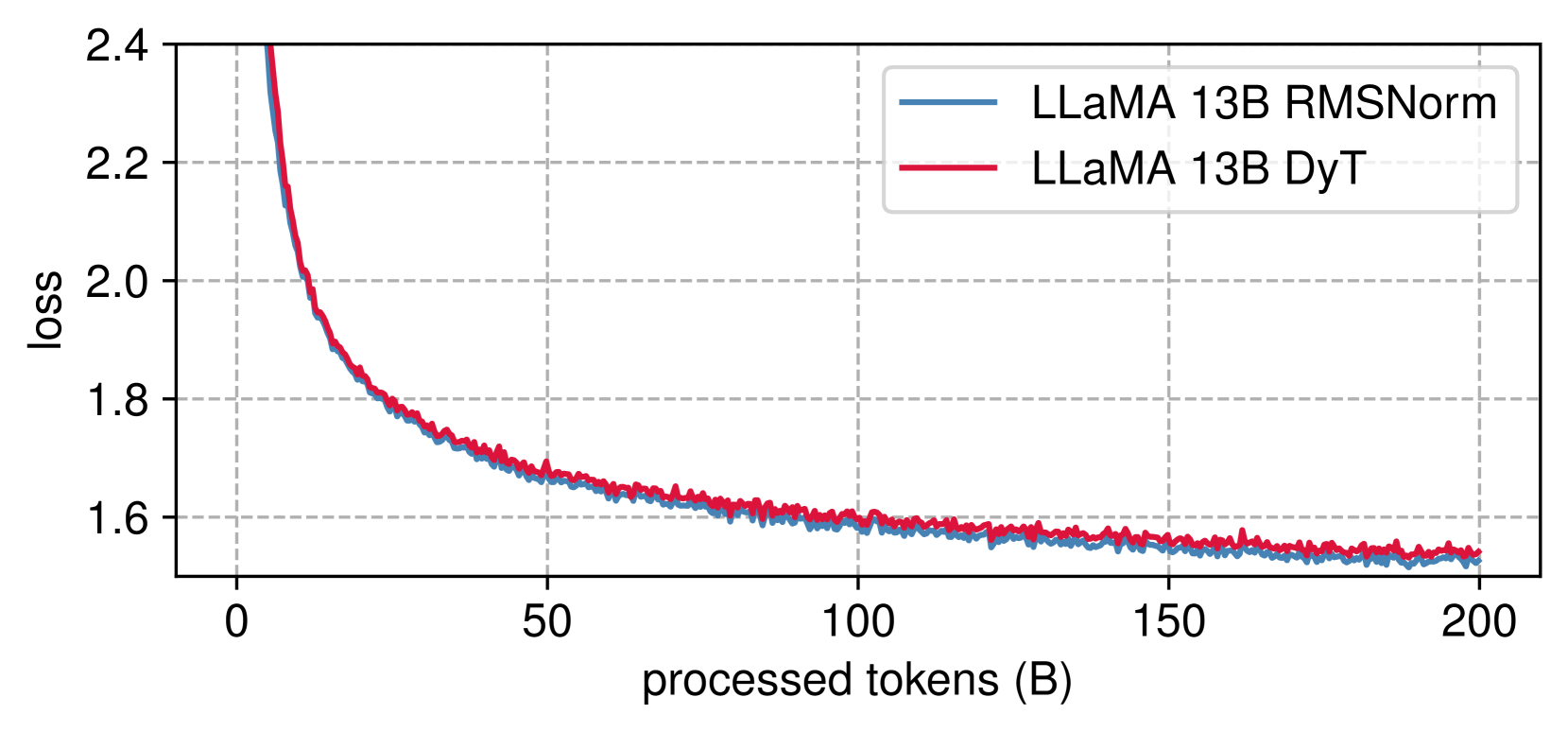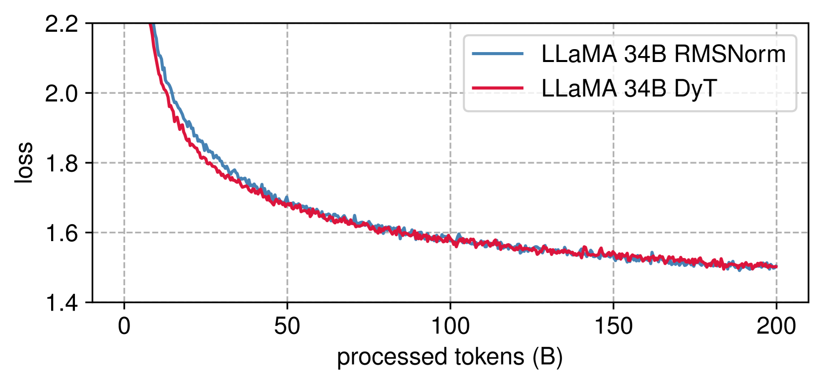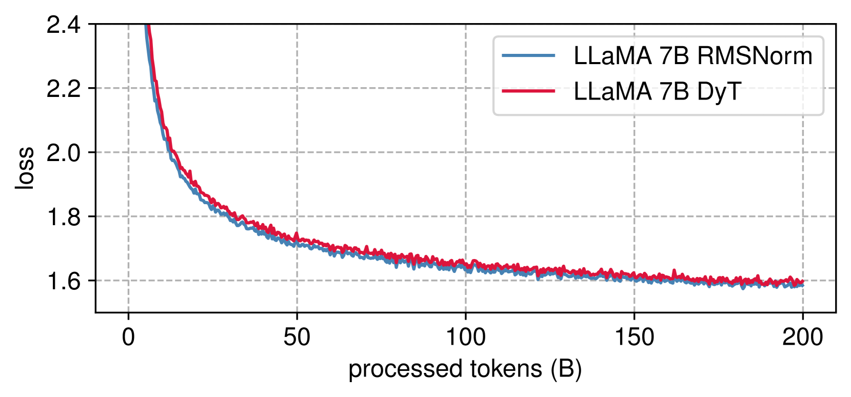 그림 6: LLaMA 사전 학습 손실. DyT 및 RMSNorm 모델의 손실 곡선은 모델 크기 전반에 걸쳐 밀접하게 정렬되어 있습니다.