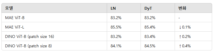 비전 도메인의 대표적인 자기 지도 학습 방법인 Masked Autoencoder(MAE, He 외, 2022)와 DINO(Caron 외, 2021)를 사용하여 벤치마크하였다. 두 방법 모두 백본(backbone)으로 ViT를 사용하지만, MAE는 재구성(reconstruction) 손실을, DINO는 공동 임베딩(joint-embedding) 손실을 사용한다. 표준적인 자기 지도 학습 프로토콜에 따라 ImageNet-1K에서 라벨 없이 사전 학습(pretrain)한 후, 분류층을 붙여 라벨을 이용하여 미세조정(fine-tune)하였다. 미세조정 결과는 표 2에 나타냈다. DyT는 자기 지도 학습에서도 LN과 동등한 성능을 보였다.