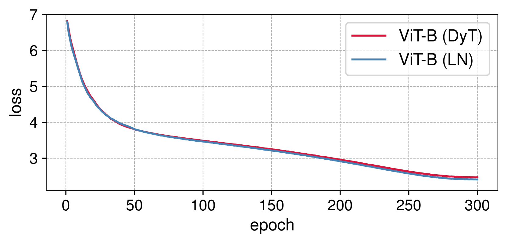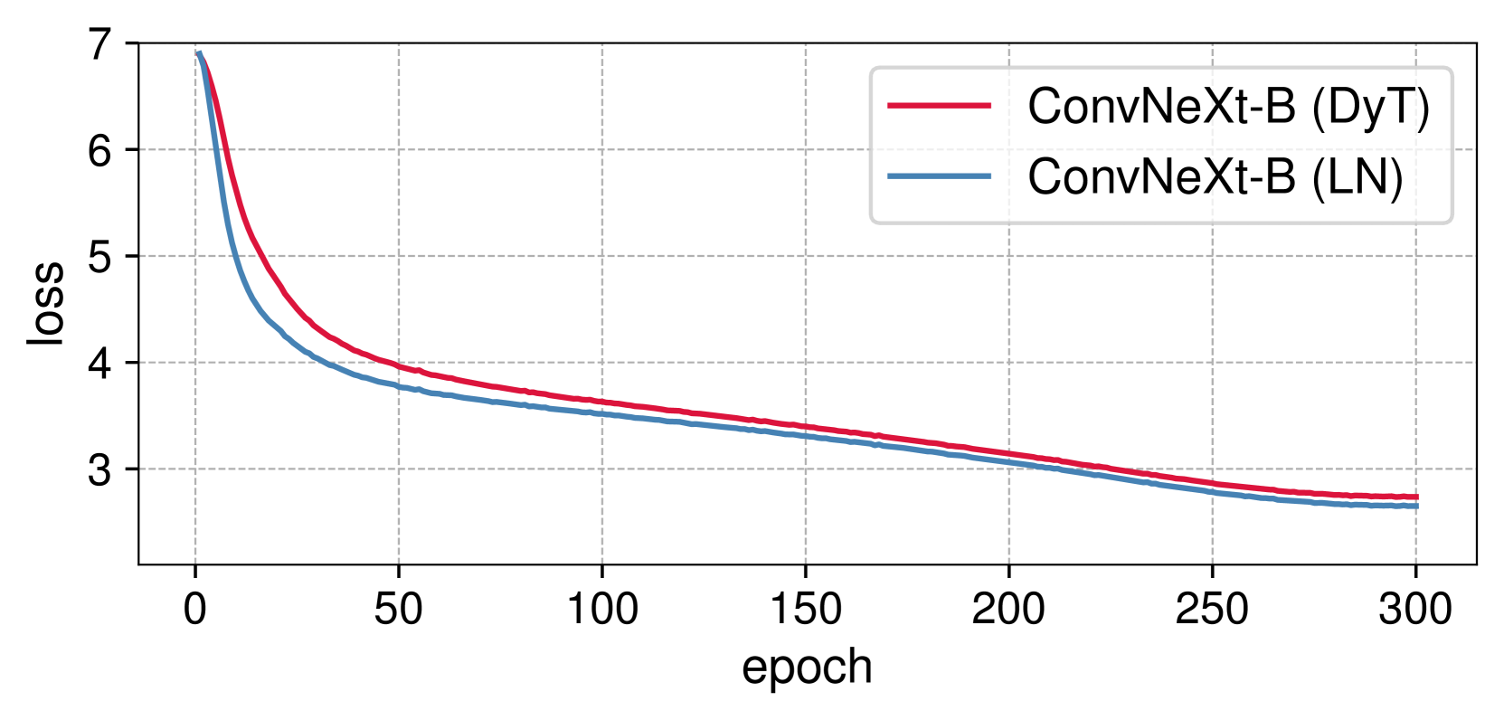 그림 5: ViT-B와 ConvNeXt-B 모델의 훈련 손실 곡선. 두 모델에서 LN과 DyT의 손실 곡선은 유사한 양상을 보이며, 학습 역학(dynamics)이 유사할 수 있음을 시사한다.