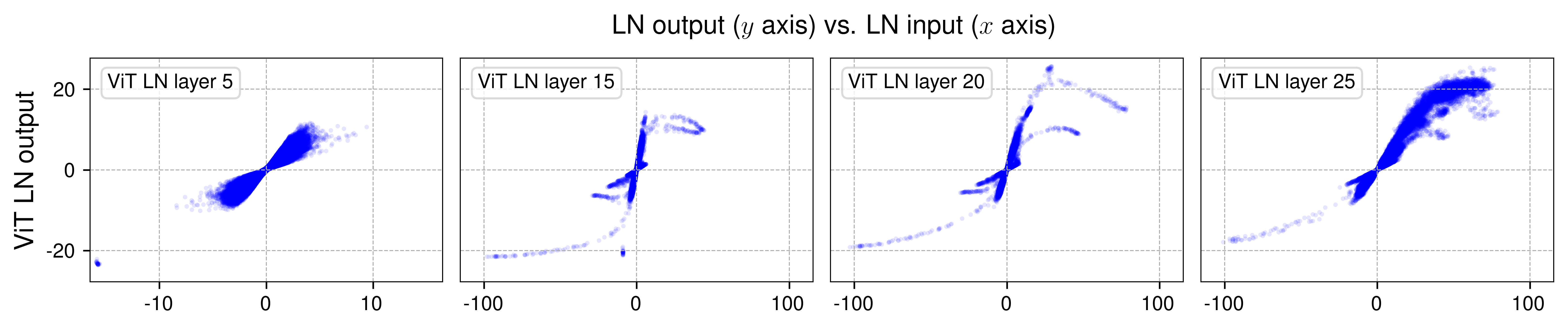이러한 S자 형태의 곡선은 중심부(x 값이 0 근처)에선 여전히 선형 형태를 보이며, 대부분의 점(약 99%)은 이 선형 범위에 존재한다. 하지만 ViT 모델에서 x가 50보다 크거나 -50보다 작은 값과 같은 극단적인 범위에 놓이는 점들이 상당수 존재한다. 정규화 층의 주된 역할은 이러한 극단적인 값을 다수의 점들과 유사한 덜 극단적인 값으로 압축(squash)하는 것이다. 이러한 압축 효과는 단순한 아핀 변환으로는 근사될 수 없으며, 우리는 이와 같은 비선형적이며 불균형적인 압축 효과가 정규화 층을 중요하고 필수불가결하게 만드는 이유일 것으로 가설을 세운다.