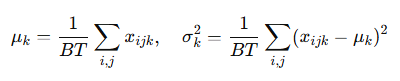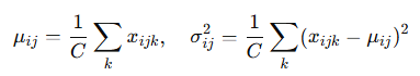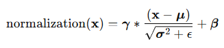 먼저, 정규화 층(normalization layers)에 대해 간략히 살펴본다. 대부분의 정규화 층은 공통된 수식을 공유한다. 입력 데이터 x의 형태(shape)가 (B,T,C)로 주어졌다고 하자. 여기서 B는 배치 크기(batch size), T는 토큰(token)의 개수, C는 각 토큰의 임베딩 차원(embedding dimension)을 나타낸다. 이때 정규화 층의 출력은 일반적으로 다음과 같은 형태로 계산된다.