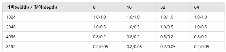 모델의 너비(width)와 깊이(depth)가 최적의 α 초기값(α₀)에 미치는 영향을 분석했다. 그 결과, 모델의 너비가 α₀ 값 선정에 결정적인 역할을 하며, 모델의 깊이는 거의 영향을 주지 않았다는 점을 발견하였다. 표 12는 다양한 너비와 깊이 조합에서 얻은 최적 α₀ 값을 보여준다. 표에서 볼 수 있듯이, 모델의 너비가 증가할수록 최적 성능을 얻기 위한 α₀ 값이 점점 작아지는 경향이 나타났다. 반면, 모델의 깊이는 α₀ 값 선정에 있어 큰 차이를 보이지 않았다.