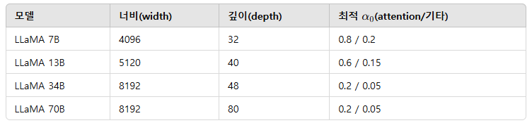 - 모델 크기가 클수록 최적 α0 값은 작아진다. 작은 모델에서 최적값을 먼저 찾으면, 더 큰 모델에서는 탐색 범위를 좁힐 수 있다.
