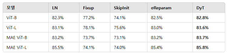 표 10: ImageNet-1K 분류 정확도. DyT는 일관되게 다른 방법들보다 우수한 성능을 달성하였다.