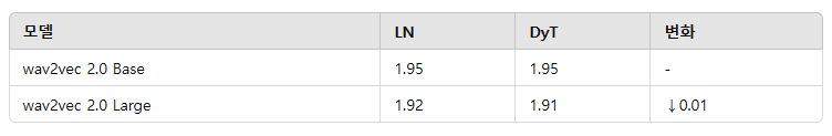 wav2vec 2.0 Transformer 모델을 LibriSpeech 데이터셋에서 사전 학습하였다. 표 5에 나타낸 결과 DyT는 LN과 동등한 성능을 보였다.