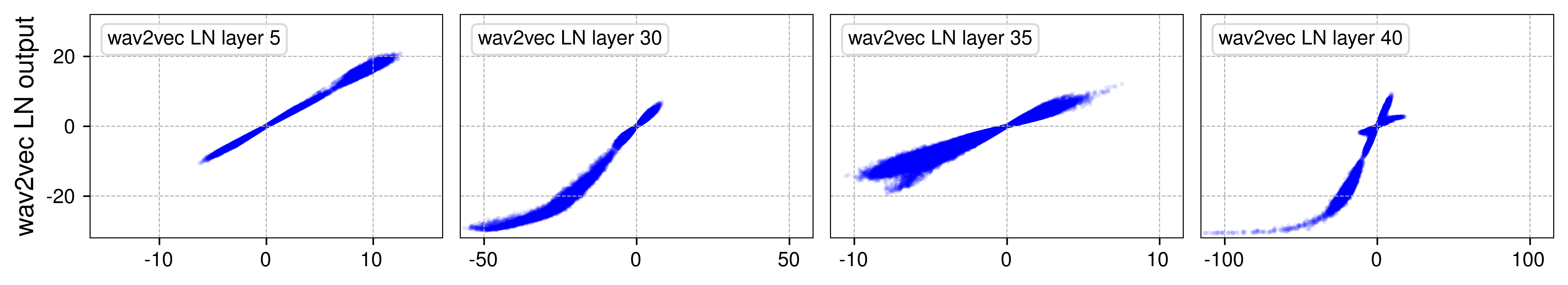 그림 2의 모든 모델에서 초반 LN층(첫 번째 열)에서는 입력과 출력 간 관계가 대부분 선형적(linear)으로 나타나, x-y 플롯에서 직선에 가까운 모습을 보였다. 그러나 보다 심층부의 LN층에서는 더 흥미로운 현상이 나타났다.