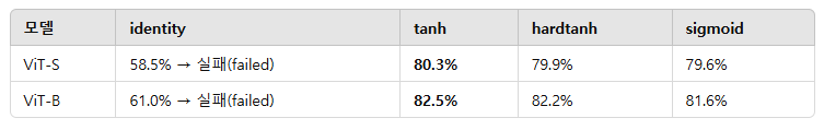 표 8: 다양한 압축(squashing) 함수 적용 시 ImageNet-1K 분류 정확도. 모든 실험은 원본 LN 모델과 동일한 학습 설정을 따름. 비선형 압축 함수는 모델 발산 방지에 결정적 역할을 하며, tanh가 가장 높은 성능을 달성했다.