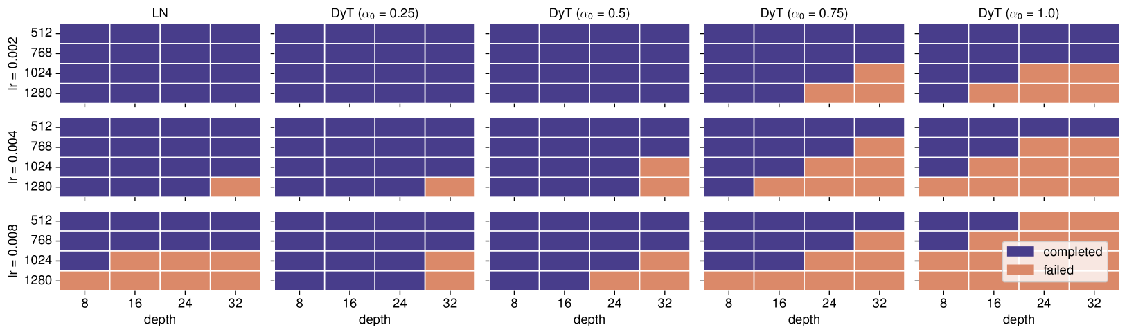 추가적인 분석 결과, 모델 크기나 학습률을 증가시키면 안정적인 학습을 위해 α0를 줄여야 한다는 점을 발견했다. 반대로, 높은 α0를 사용하려면 학습률을 낮춰야 불안정성을 줄일 수 있었다. 그림 10은 ImageNet-1K 지도학습 ViT 모델의 안정성을 학습률, 모델 크기, α0 값에 따라 분석한 결과를 보여준다. 큰 모델일수록 불안정해져, 안정적 학습을 위해 작은 α0 값이나 낮은 학습률이 필요했다. LN 기반 모델에서도 비슷한 불안정성이 관찰되었으며, DyT에서 α0=0.5를 사용할 경우 LN과 매우 유사한 안정성을 보였다.