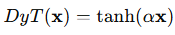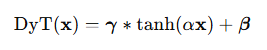 여기서 α는 학습 가능한 매개변수이다. DyT는 α를 통해 적절한 스케일링을 학습하고, 경계가 있는 tanh 함수를 사용하여 극단적인 값들을 억제함으로써 LN 층과 유사한 효과를 낸다. 특히 정규화 층과 달리 활성값의 통계량을 계산할 필요 없이 이러한 효과를 달성할 수 있다.