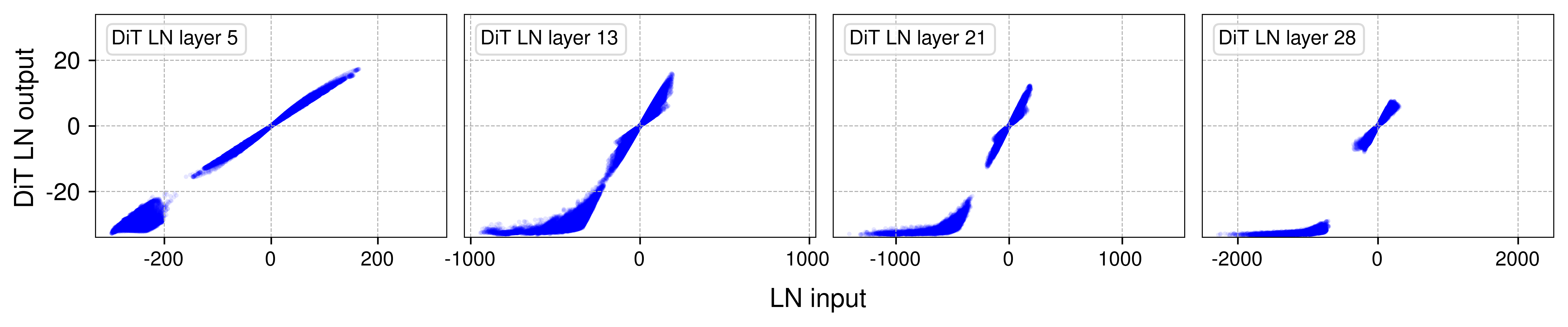 그림 4의 왼쪽 두 패널에서 같은 색으로 나타낸 각 토큰의 활성값은 실제로 직선을 형성한다. 그러나 각 토큰의 분산이 다르기 때문에 직선의 기울기는 서로 다르다. 입력 범위가 작은 토큰들은 표준편차가 작으므로 LN은 이들의 활성값을 작은 값으로 나누게 되어 기울기가 커진다. 이렇게 모인 직선들이 전체적으로 tanh 형태의 S자 곡선을 형성한다. 오른쪽 두 패널에서는 각 채널마다 활성값의 입력 범위가 매우 다르며, 일부 소수의 채널만이 큰 극단값을 가지는 것이 확인된다. LN 층은 이 채널들의 극단적인 값을 가장 많이 압축한다.