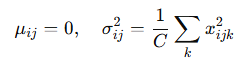 여기서 ϵ은 매우 작은 상수(small constant)이며, γ와 β는 학습 가능한(learnable) 매개변수로서 형태가 (C,)인 벡터이다. γ는 스케일링(scaling), β는 시프팅(shifting)을 담당하는 아핀(affine) 매개변수로서, 이를 통해 출력값이 임의의 범위를 가지도록 조정된다. 여기서 μ와 σ^2는 입력의 평균(mean)과 분산(variance)을 의미하며, 각 정규화 방법에 따라 계산 방식이 달라진다. 따라서 이 통계량들의 차원 또한 각 방법마다 다르며, 실제 계산에서는 브로드캐스팅(broadcasting)을 통해 차원이 맞춰진다.