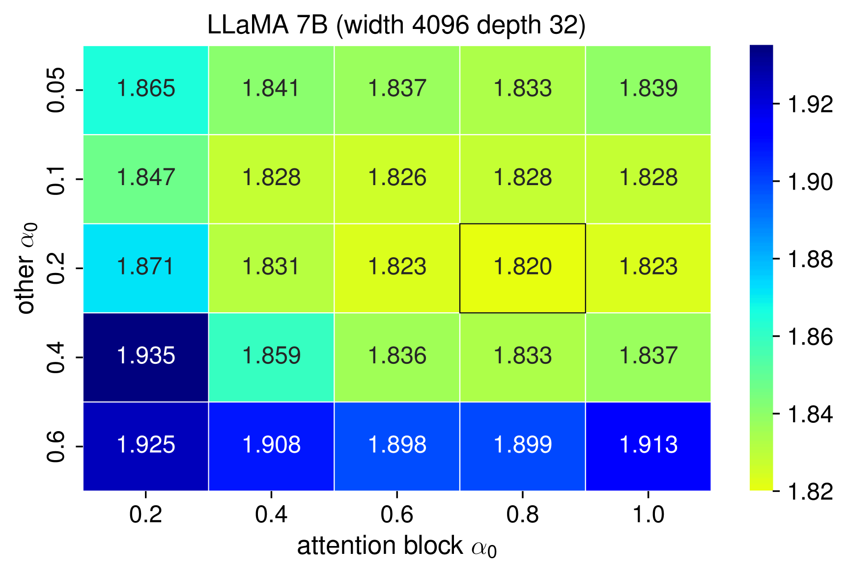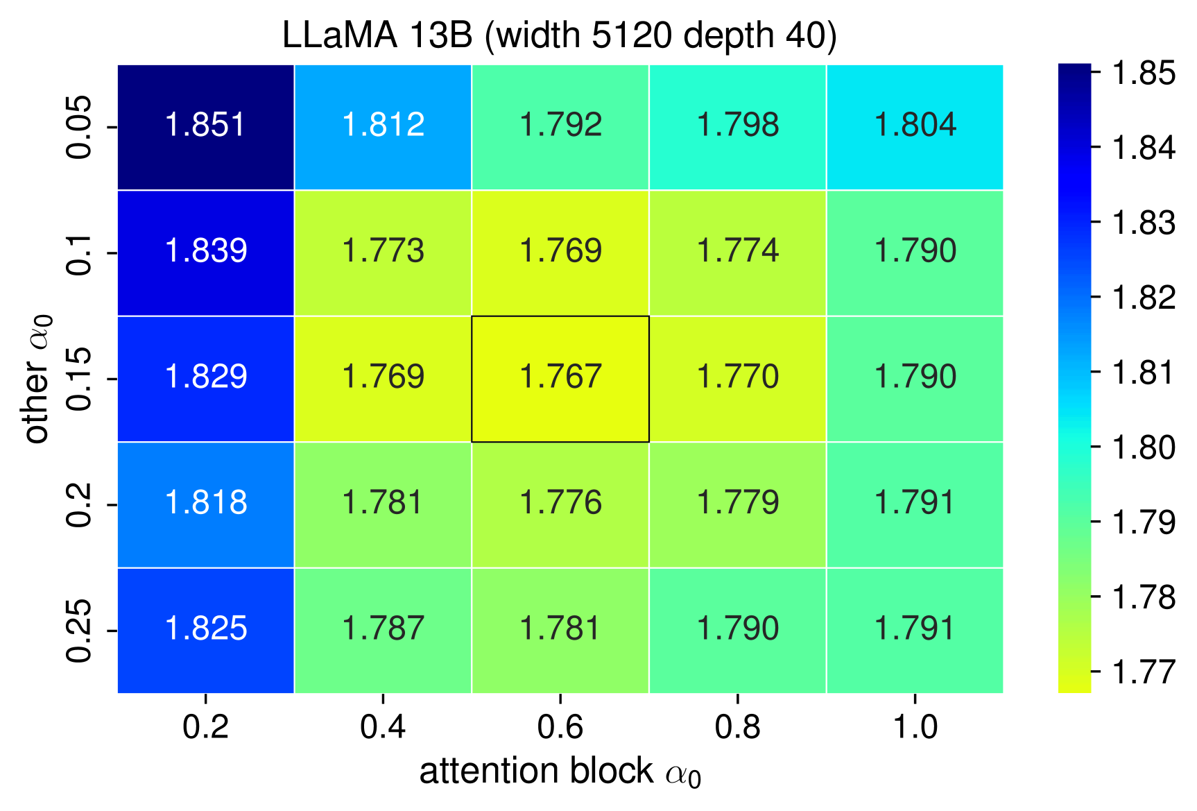 그림 11: 서로 다른 α0 설정에 따른 30B 토큰에서의 손실 값 히트맵. 두 LLaMA 모델 모두 attention 블록에서 높은 α0 값이 성능 향상에 도움이 되었다.